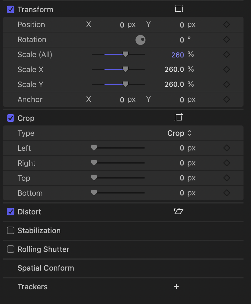 파이널컷 프로의 Video Inspector에서 영상의 크기와 형태를 조절할 수 있는 옵션이 있습니다.