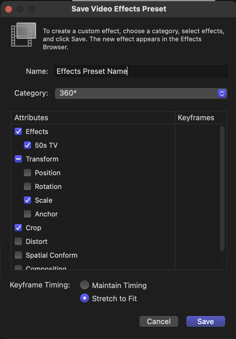 자주 쓰이는 효과는 Video Inspector 하단의 Save Effects Preset 버튼을 눌러 저장해 사용할수도 있습니다.