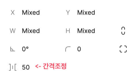 또는 n개의 오브젝트 선택 후 오른쪽 Design 패널에서 수치 값을 조정하여 간격을 조정할 수 있음.